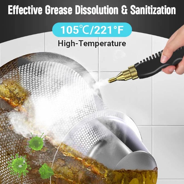 Puterea nominală de 2500W generează abur de până la 105℃ în mai puțin de 10 secunde, îndepărtând rapid grăsimea, murdăria, praful și petele de pe diverse suprafețe.
