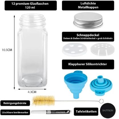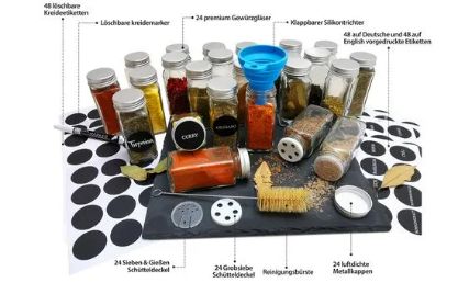 Nu primiți doar 24 de borcane de condimente grozave, ci un set complet în care veți găsi tot ce aveți nevoie. Sunt incluse 48 de autocolante rotunde pre-tipărite cu numele condimentelor în germană, 48 de autocolante rotunde pre-tipărite cu numele condimentelor în franceză și 48 de autocolante rotunde goale pe care puteți scrie cu ajutorul creionului de cretă de înaltă calitate inclus.