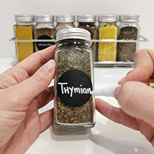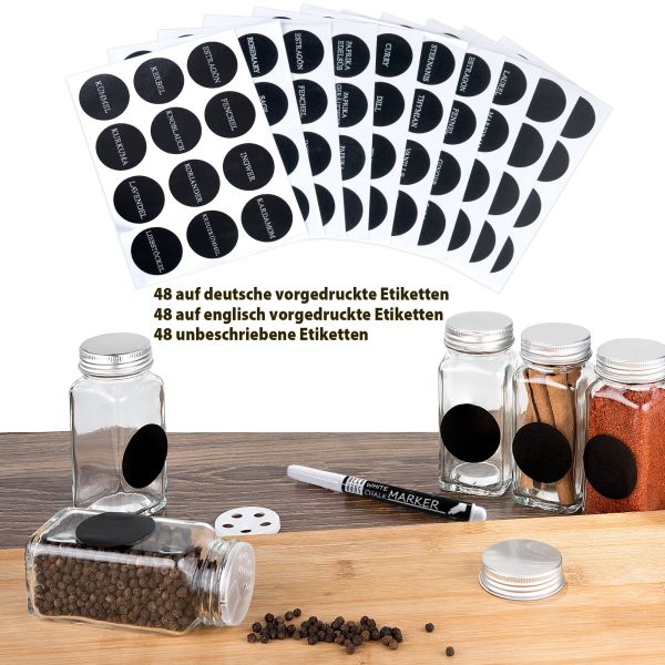- ETICHETAȚI-VĂ CONDIMENTELE CA UN PROFESIONIST! – Setul de borcane de condimente cu capac include, de asemenea, 48 de etichete în franceză și germană cu numele celor mai comune condimente tipărite pe ele și 48 de etichete goale pe care puteți scrie cu creta inclusă.