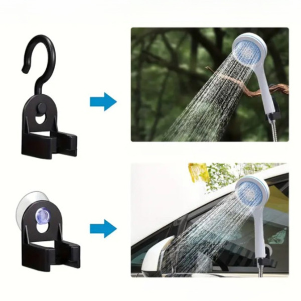 Ventuza fixează capul de duș pe orice suprafață plană; cârligul îl ridică mai sus când ai nevoie de el deasupra capului. La 600 g și 1,5 m de furtun, încape în orice geantă, se încarcă pe drum și funcționează indiferent dacă clătești noroiul de pe cizme sau speli câinele după o plimbare lungă.